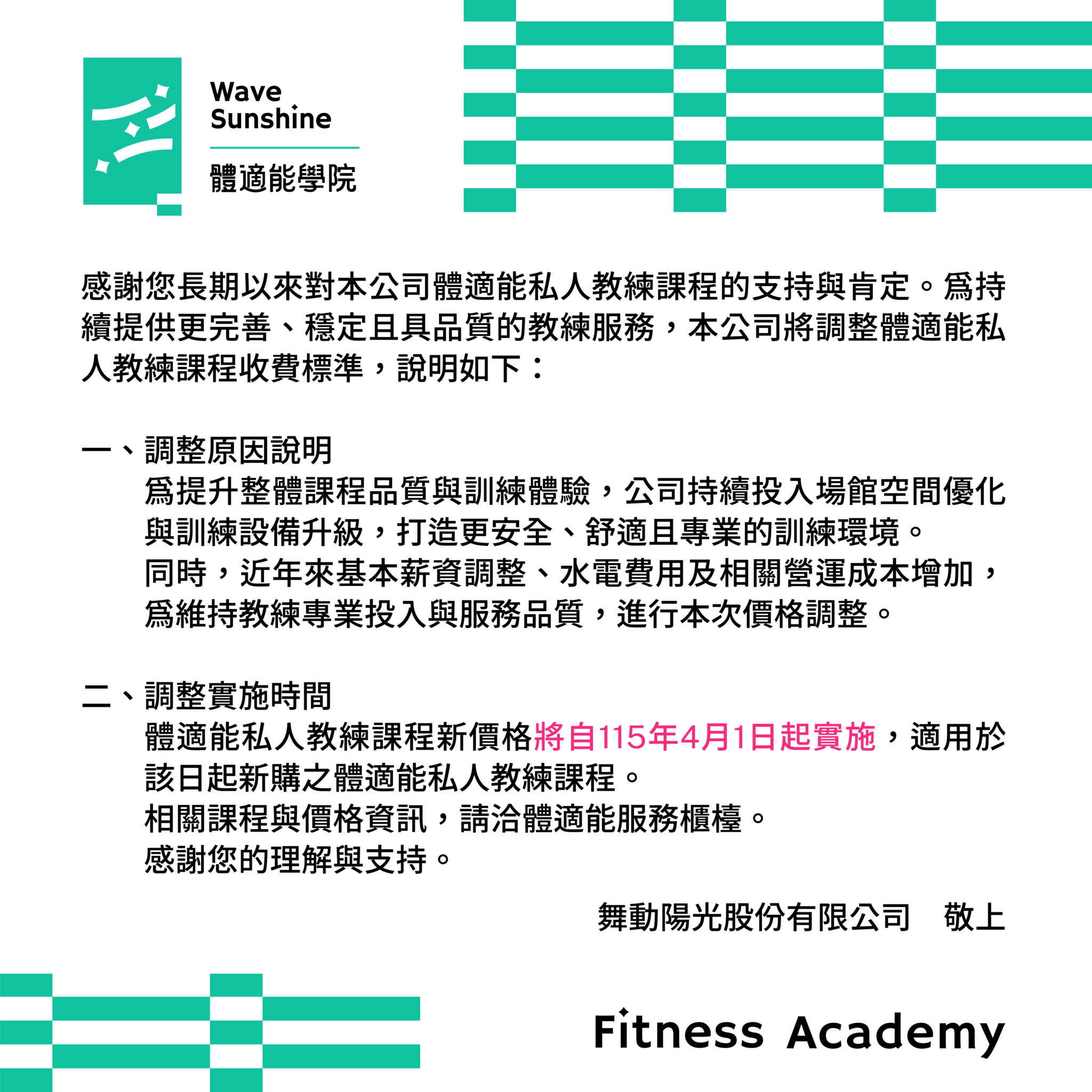 15 days ago 鳳山體育園區 in 園區公告 96 【體適能私人教練課程漲價說明】 親愛的學員您好 感謝您一直以來對本中心體適能私人教練課程的支持與信任 為了持續提升課程品質、教練服務與更優質的運動空間,並因應近年營運成本增加,我們將調整體適能私人教練課程收費標準。 新價格將自民國 115 年 4 月 1 日起實施 並適用於該日起新購之私人教練課程。 造成不便我們深感抱歉,也謝謝您的理解與支持。 我們會持續用更好的服務與品質回應您的信任