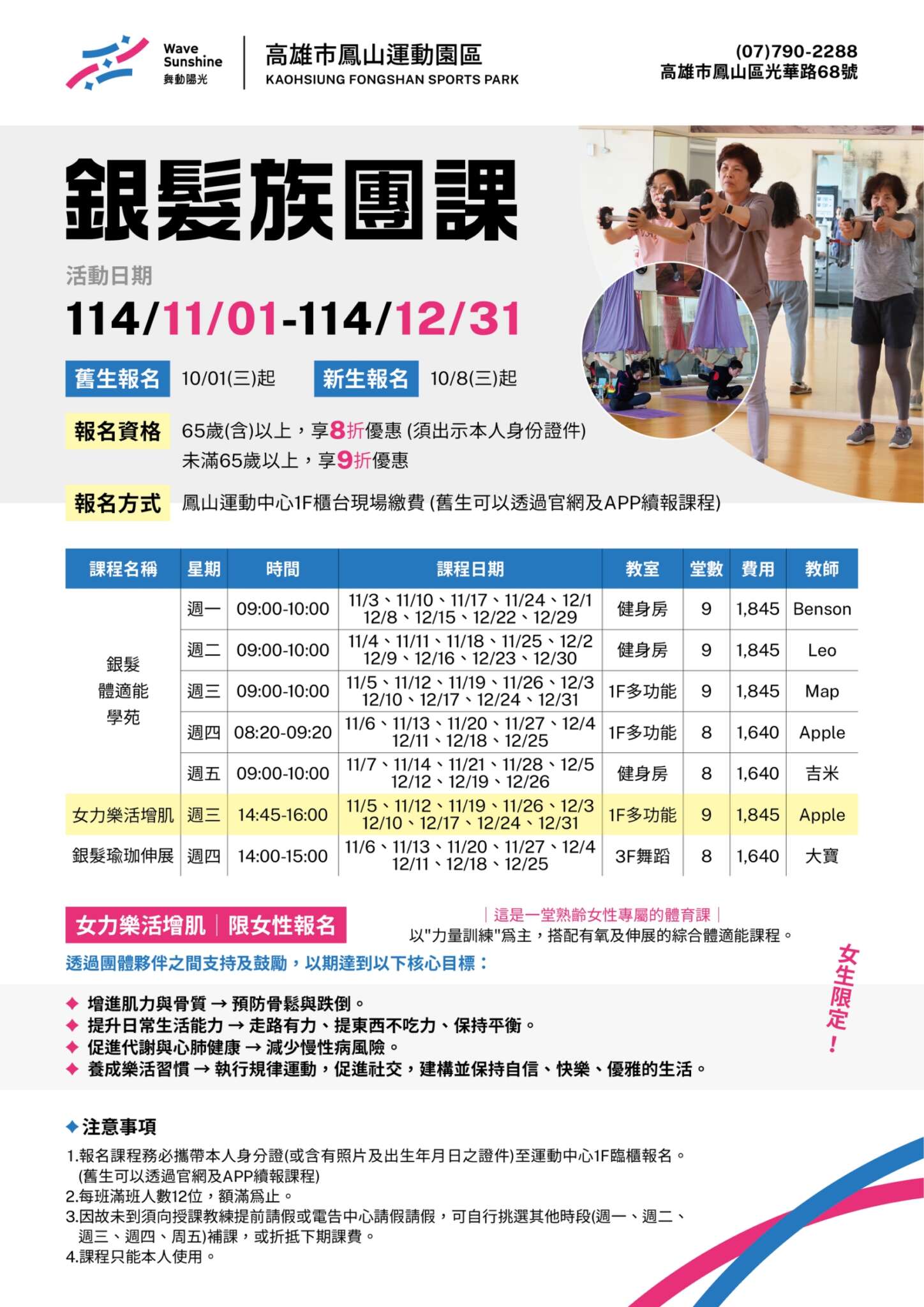 鳳山運動園區為 55-65 歲的朋友們準備了專屬課程